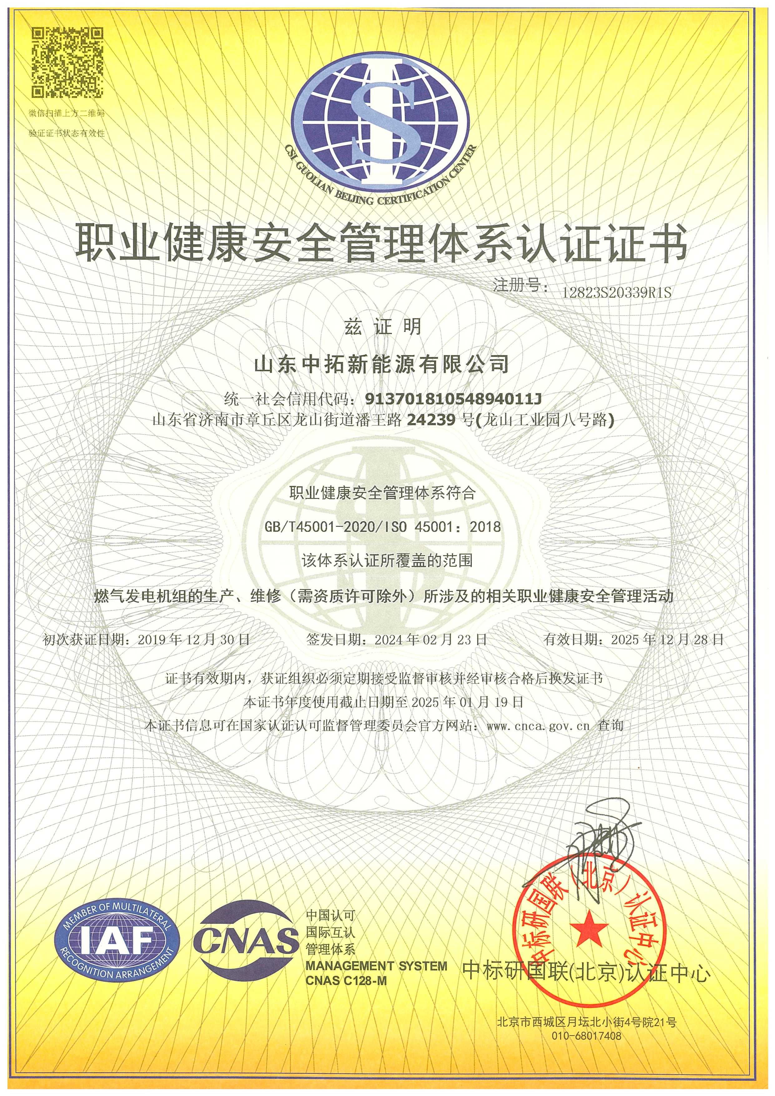 職業健康安全管理體系認證證書